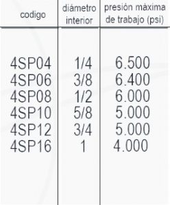 | Codigo | 4SP04 1/4 – 6.500, 4SP06 3/8 – 6.400, 4SP08 1/2 – 6.000, 4SP10 5/8 – 5.000, 4SP12 3/4 – 5.000, 4SP16 1 – 4.000 |