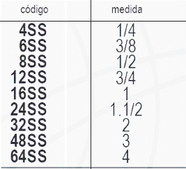 4SS 1/4, 6SS 3/8, 8SS 1/2, 12SS 3/4, 16SS 1, 24SS 1.1/2, 32SS 2, 48SS 3, 64SS 4