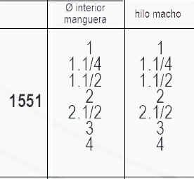 | Codigo | 1551 1 – 1, 1551 1.1/4 – 1.1/4, 1551 1.1/2 – 1.1/2, 1551 2 – 2, 1551 2.1/2 – 2.1/2, 1551 3 – 3, 1551 4 – 4 |