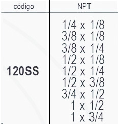 | Codigo | 120SS 1/4×1/8, 120SS 3/8×1/8, 120SS 3/8×1/4, 120SS 1/2×1/8, 120SS 1/2×1/4, 120SS 1/2×3/8, 120SS 3/4×1/2, 120SS 1×1/2, 120SS 1×3/4 |