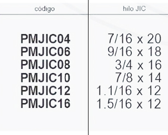 | Codigo | PMJIC04 7/16 x 20, PMJIC06 9/16 x 18, PMJIC08 3/4 x 16, PMJIC10 7/8 x 14, PMJIC12 1.1/16 x 12, PMJIC16 1.5/16 x 12 |