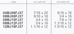 | Codigo | 04MJ06FJC37 7/16 x 20 – 9/16 x 18, 06MJ08FJC37 9/16 x 18 – 3/4 x 16, 08MJ10FJC37 3/4 x 16 – 7/8 x 14, 08MJ12FJC37 3/4 x 16 – 1.1/16 x 12, 12MJ16FJC37 1.1/16 x 12 – 1.5/16 x 12 |