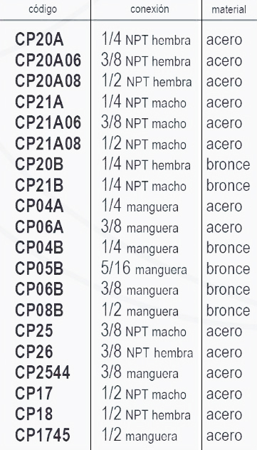 | Codigo | CP20A 1/4NPT hembra – acero, CP20A06 3/8NPT hembra – acero, CP20A08 1/2NPT hembra – acero, CP21A 1/4NPT macho – acero, CP21A06 3/8NPT macho – acero, CP21A08 1/2NPT macho – acero, CP20B 1/4NPT hembra – bronce, CP21B 1/4NPT macho – bronce, CP04A 1/4 manguera – acero, CP06A 3/4 manguera – acero, CP04B 1/4 manguera – bronce, CP05B 5/16 manguera – bronce, CP06B 3/8 manguera – bronce, CP08B 1/2 manguera – bronce, CP25 3/8NPT macho – acero, CP26 3/8NPT hembra – acero, CP2544 3/8 manguera – acero, CP17 1/2NPT macho – acero, CP18 1/2NPT hembra – acero, CP1745 1/2 manguera – acero |