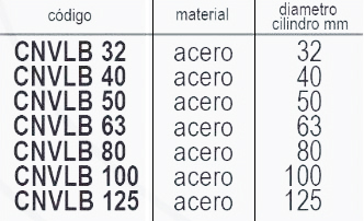 | codigo | CNVLB 32 acero – 32, CNVLB 40 acero – 40, CNVLB 50 acero – 50, CNVLB 63 acero – 63, CNVLB 80 acero – 80, CNVLB 100 acero – 100, CNVLB 125 acero – 125 |