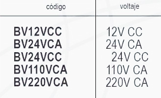 | Codigo | BV12VCC 12V CC, BV24VCA 24V CA, BV24VCC 24V CC, BV110VCA 110V CA, BV220VCA 220V CA |