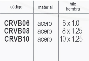 | Medidas | CRVB06 – acero – 6×1.0, CRVB08 – acero – 8×1.25, CRVB10 – acero – 10×1.25 |