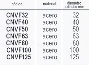 | codigo | CNVF32 acero – 32, CNVF40 acero – 40, CNVF50 acero – 50, CNVF63 acero – 63, CNVF80 acero – 80, CNVF100 acero – 100, CNVF125 acero – 125 |