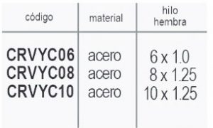 | Medidas | CRVYC06 – acero – 6×1.0, CRVYC08 – acero – 8×1.25, CRVYC10 – acero – 10×1.25 |