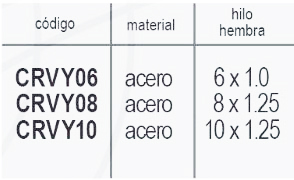 | Medidas | CRVY06 – acero – 6×1.0, CRVY08 – acero – 8×1.25, CRVY10 – acero – 10×1.25 |