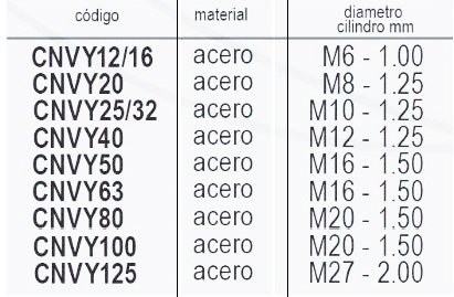 | codigo | CNVY12/16 – acero – M6-1.00, CNVY20 – acero – M8-1.25, CNVY25/32 – acero – M10-1.25, CNVY40 – acero – M12-1.25, CNVY50 – acero – M16-1.50, CNVY63 – acero – M16-1.50, CNVY80 – acero – M20-1.50, CNVY100 – acero – M20-1.50, CNVY125 – acero – M27-2.00 |