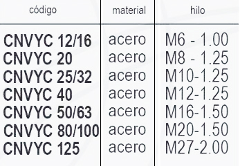 | codigo | CNVYC12/16 – acero – M6-1.00, CNVYC20 – acero – M8-1.25, CNVYC25/32 – acero – M10-1.25, CNVYC40 – acero – M12-1.25, CNVYC50/63 – acero – M16-1.50, CNVYC80/100 – acero – M20-1.50, CNVYC125 – acero – M27-2.00 |