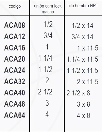 | Codigo | ACA08 1/2 – 1/2×14, ACA12 3/4 – 3/4×14, ACA16 1 – 1×11.5, ACA20 1.1/4 – 1.1/4×11.5, ACA24 1.1/2 – 1.1/2×11.5, ACA32 2 – 2×11.5, ACA40 2.1/2 – 2.1/2×8, ACA48 3 – 3×8, ACA64 4 – 4×8 |