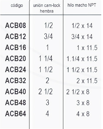 | Codigo | ACB08 1/2 – 1/2×14, ACB12 3/4 – 3/4×14, ACB16 1 – 1×11.5, ACB20 1.1/4 – 1.1/4×11.5, ACB24 1.1/2 – 1.1/2×11.5, ACB32 2 – 2×11.5, ACB40 2.1/2 – 2.1/2×8, ACB48 3 – 3×8, ACB64 4 – 4×8 |