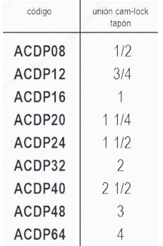 | Codigo | ACDP08 1/2, ACDP12 3/4, ACDP16 1, ACDP20 1.1/4, ACDP24 1.1/2, ACDP32 2, ACDP40 2 1/2, ACDP48 3, ACDP64 4 |