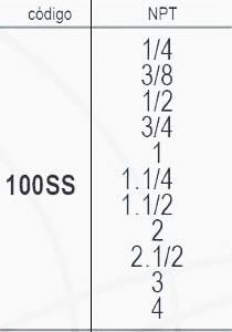 | Codigo | 100SS 1/4, 100SS 3/8, 100SS 1/2, 100SS 3/4, 100SS 1, 100SS 1.1/4, 100SS 1.1/2, 100SS 2, 100SS 2.1/2, 100SS 3, 100SS 4 |
