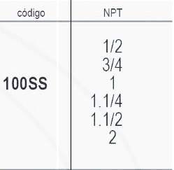 | Codigo | 100SS-1/2, 100SS-3/4, 100SS-1, 100SS-1.1/4, 100SS-1.1/2, 100SS-2 |