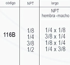 | Codigo | 116B 1/8 – NPT 1/4 hembra x 1/8 macho, 116B 1/4 – NPT 3/8 hembra x 1/4 macho, 116B 3/8 – NPT 1/8 hembra x 1/4 macho, 116B 1/2 NPT 1/4 hembra x 3/8 macho |