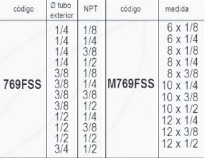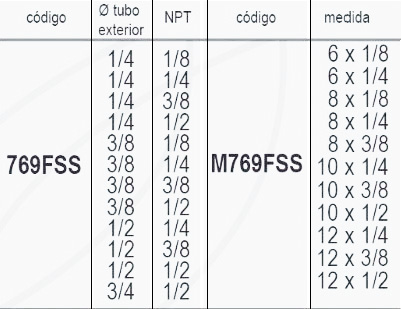 | Codigo | 769FSS 1/4 – 1/8, 769FSS 1/4 – 1/4, 769FSS 1/4 – 3/8, 769FSS 1/4 – 1/2, 769FSS |