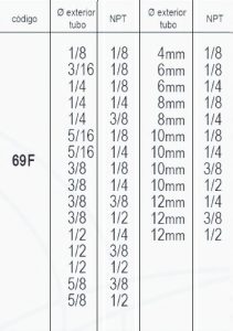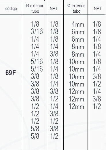 | Codigo | 69F 1/8 – 1/8NPT – 4mm – 1/8NPT, 69F 3/16 – 1/8NPT – 6mm – 1/8NPT, 69F 1/4 – 1/8NPT – 6mm – 1/4NPT, 69F 1/4 – 1/4NPT – 8mm – 1/8NPT, 69F 1/4 – 3/8NPT – 8mm – 1/4NPT, 69F 5/16 – 1/8NPT – 10mm – 1/8NPT, 69F 5/16 – 1/4NPT – 10mm – 1/4NPT, 69F 3/8 – 1/8NPT – 10mm – 3/8NPT, 69F 3/8 – 1/4NPT – 10mm – 1/2NPT, 69F 3/8 – 3/8NPT – 12mm – 1/4NPT, 69F 3/8 – 1/2NPT – 12mm – 3/8NPT, 69F 1/2 – 1/4NPT – 12mm – 1/2NPT, 69F 1/2 – 3/8NPT, 69F 1/2 – 1/2NPT, 69F 5/8 – 3/8NPT, 69F 5/8 – 1/2NPT |