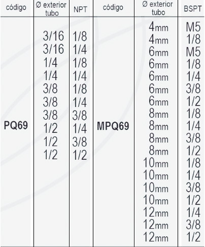 | Codigo | PQ69 3/16 – 1/8, PQ69 3/16 – 1/4, PQ69 1/4 – 1/8, PQ69 1/4 – 1/4, PQ69 3/8 – 1/8, PQ69 3/8 – 1/4, PQ69 3/8 – 3/8, PQ69 1/2 – 1/4, PQ69 1/2 – 3/8, PQ69 1/2 – 1/2, MPQ69 4mm – 5M, MPQ69 4mm – 1/8, MPQ69 4mm – 1/4, MPQ69 6mm – 5M, MPQ69 6mm – 1/8, MPQ69 6mm – 1/4, MPQ69 6mm – 3/8, MPQ69 8mm – 1/8, MPQ69 8mm – 1/4, MPQ69 8mm – 3/8, MPQ69 8mm – 1/2, MPQ69 10mm – 1/8, MPQ69 10mm – 1/4, MPQ69 10mm – 3/8, MPQ69 10mm – 1/2, MPQ69 |