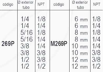 | Codigo | 269P 1/4 – 1/8, 269P 1/4 – 1/4, 269P 5/16 – 1/8, 269P 5/16 – 1/4, 269P 3/8 – 1/4, 269P 3/8 – 3/8, 269P 1/2 – 3/8, 269P 1/2 – 1/2, M269P 6mm – 1/8, M269P 6mm – 1/4, M269P 8mm – 1/8, M269P 8mm – 1/4, M269P 10mm – 1/4, M269P 10mm – 3/8, M269P 12mm – 3/8, M269P 12mm – 1/2 |
