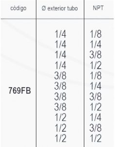 | Codigo | 769FB 1/4 – 1/8, 769FB 1/4 – 1/4, 769FB 1/4 – 3/8, 769FB 1/4 – 1/2, 769FB 3/8 – 1/8, 769FB 3/8 – 1/4, 769FB 3/8 – 3/8, 769FB 3/8 – 1/2, 769FB 1/2 – 1/4, 769FB 1/2 – 3/8, 769FB 1/2 – 1/2 |