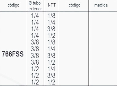 | Codigo | 766FSS 1/4 – 1/8, 766FSS 1/4 – 1/4, 766FSS 1/4 – 3/8, 766FSS 1/4 – 1/2, 766FSS 3/8 – 1/8, 766FSS 3/8 – 1/4, 766FSS 3/8 – 3/8, 766FSS 3/8 – 1/2, 766FSS 1/2 – 1/4, 766FSS 1/2 – 3/8, 766FSS 1/2 – 1/2 |