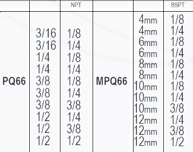| Codigo | PQ66 3/16 – 1/8, PQ66 3/16 – 1/4, PQ66 1/4 – 1/8, PQ66 1/4 – 1/4, PQ66 3/8 – 1/8, PQ66 3/8 – 1/4, PQ66 3/8 – 3/8, PQ66 1/2 – 1/4, PQ66 1/2 – 3/8, PQ66 1/2 – 1/2, MPQ66 4mm – 1/8, MPQ66 4mm – 1/4, MPQ66 6mm – 1/8, MPQ66 6mm – 1/4, MPQ66 8mm – 1/8, MPQ66 8mm – 1/4, MPQ66 10mm – 1/8, MPQ66 10mm – 1/4, MPQ66 10mm – 3/8, MPQ66 12mm – 1/4, MPQ66 12mm – 3/8, MPQ66 12mm – 1/2 |