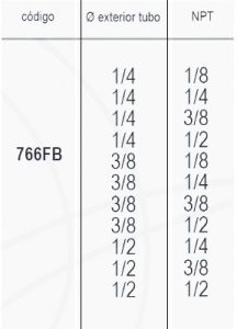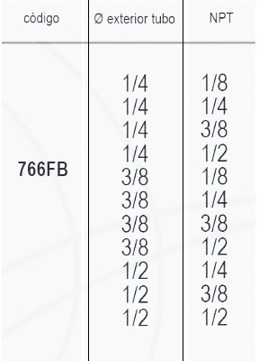 | Codigo | 766FB 1/4 – 1/8, 766FB 1/4 – 1/4, 766FB 1/4 – 3/8, 766FB 1/4 – 1/2, 766FB 3/8 – 1/8, 766FB 3/8 – 1/4, 766FB 3/8 – 3/8, 766FB 3/8 – 1/2, 766FB 1/2 – 1/4, 766FB 1/2 – 3/8, 766FB 1/2 – 1/2 |