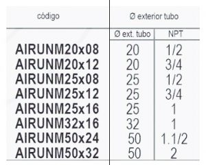 | Codigo | AIRUNM20x08 – 20 – 1/2, AIRUNM20x12 – 20 – 3/4, AIRUNM25x08 – 25 – 1/2, AIRUNM25x12 – 25 – 3/4, AIRUNM25x16 – 25 – 1, AIRUNM32x16 – 32 – 1, AIRUNM50x24 – 50 – 1.1/2, AIRUNM50x32 – 50 – 2 |