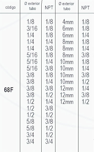 | Codigo | 68F 1/8 – 1/8NPT, 68F 3/16 – 1/8NPT, 68F 1/4 – 1/8NPT, 68F 1/4 – 1/4NPT, 68F 1/4 – 3/8NPT, 68F 5/16 – 1/8NPT, 68F 5/16 – 1/4NPT, 68F 5/16 – 3/8NPT, 68F 3/8 – 1/8NPT, 68F 3/8 – 1/4NPT, 68F 3/8 – 3/8NPT, 68F 3/8 – 1/2NPT, 68F 1/2 – 1/4NPT, 68F 1/2 – 3/8NPT, 68F 1/2 – 1/2NPT, 68F 5/8 – 3/8NPT, 68F 5/8 – 1/2NPT, 68F 3/4 – 1/2NPT, 68F 3/4 – 3/4NPT, 68F 4mm – 1/8NPT, 68F 6mm – 1/8NPT, 68F 6mm – 1/4NPT, 68F 8mm – 1/8NPT, 68F 8mm – 1/4NPT, 68F 8mm – 3/8NPT, 68F 10mm – 1/8NPT, 68F 10mm – 1/4NPT, 68F 10mm – 3/8NPT, 68F 10mm – 1/2NPT, 68F 12mm – 1/4NPT, 68F 12mm – 3/8NPT, 68F 12mm – 1/2NPT |