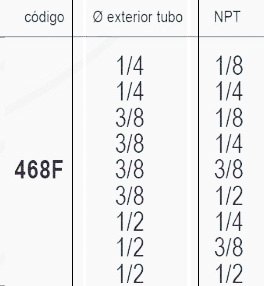 | Codigo | 468F 1/4 – 1/8, 468F 1/4 – 1/4, 468F 3/8 – 1/8, 468F 3/8 – 1/4, 468F 3/8 – 3/8, 468F |