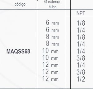 | Codigo | MAQSS68 6mm – 1/8, MAQSS68 6mm – 1/4, MAQSS68 8mm – 1/8, MAQSS68 8mm – 1/4, MAQSS68 10mm – 1/4, MAQSS68 10mm – 3/8, MAQSS68 12mm – 1/4, MAQSS68 12mm – 3/8, MAQSS68 12mm – 1/2 |