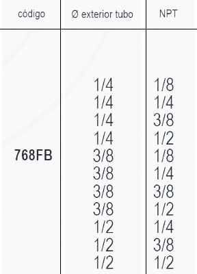 | Codigo | 768FB 1/4 – 1/8, 768FB 1/4 – 1/4, 768FB 1/4 – 3/8, 768FB 1/4 – 1/2, 768FB 3/8 – 1/8, 768FB 3/8 – 1/4, 768FB 3/8 – 3/8, 768FB 3/8 – 1/2, 768FB 1/2 – 1/4, 768FB 1/2 – 3/8, 768FB 1/2 – 1/2 |