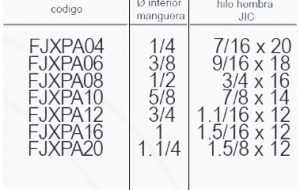 | Codigo | FJXPA04 1/4 – 7/16 x 20, FJXPA06 3/8 – 9/16 x 18, FJXPA08 1/2 – 3/4 x 16, FJXPA10 5/8 – 7/8 x 14, FJXPA12 3/4 – 1.1/16 x 12, FJXPA16 1 – 1.5/16 x 12, FJXPA20 1.1/4 – 1.5/8 x 12 |