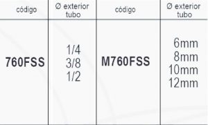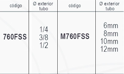 | Codigo | 760FSS 1/4, 760FSS 3/8, 760FSS 1/2, M760FSS 6mm, M760FSS 8mm, M760FSS |