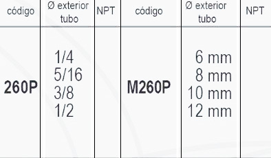 | Codigo | 260P 1/4, 260P 5/16, 260P 3/8, 260P 1/2, M260P 6mm, M260P 8mm, M260P |