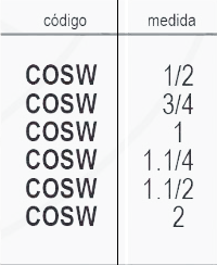 | Codigo | COSW-1/2, COSW-3/4, COSW-1, COSW-1.1/4, COSW-1.1/2, COSW-2 |