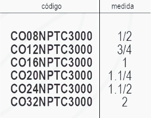 | Codigo | CO08NPTC3000 1/2, CO12NPTC3000 3/4, CO16NPTC3000 1, CO20NPTC3000 1.1/4, CO24NPTC3000 1.1/2, CO32NPTC3000 2 |