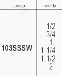 | Codigo | 103SSSW-1/2, 103SSSW-3/4, 103SSSW-1, 103SSSW-1.1/4, 103SSSW-1.1/2, 103SSSW-2 |