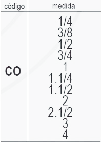 | Codigo | CO-1/4, CO-3/8, CO-1/2, CO-3/4, CO-1, CO-1.1/4, CO-1.1/2, CO-2, CO-2.1/2, CO-3, CO-4 |