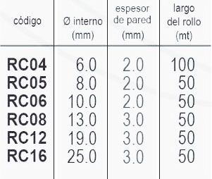 | Codigo | RC04 – 6.0 – 2.0 – 100, RC05 – 8.0 – 2.0 – 50, RC06 – 10.0 – 2.0 – 50, RC08 – 13.0 – 3.0 – 50, RC12 – 19.0 – 3.0 – 50, RC16 – 25.0 – 3.0 – 50 |