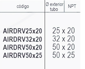 | Codigo | AIRDRV25x20 25×20, AIRDRV32x20 32×20, AIRDRV50x20 50×20, AIRDRV50x25 50×25 |