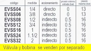 | Codigo | EVSS04 1/4 – directo – 0 – 13, EVSS06 3/8 – directo – 0 – 13, EVSS08 1/2 – indirecto – 0.5 – 16, EVSS12 3/4 – indirecto – 0.5 – 16, EVSS16 1 – indirecto – 0.5 – 16, EVSS24 1.1/2 – indirecto – 0.5 – 16, EVSS32 2 – indirecto – 0.5 – 16 |