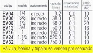 | Codigo | EV04 1/4 – directo – 3.2 – 0.0 – 10, EV06 3/8 – indirecto – 38.0 – 0.1 – 20, EV08 1/2 – indirecto – 38.0 – 0.1 – 20, EV12 3/4 – indirecto – 50.0 – 0.1 – 16, EV16 1 – indirecto – 190.0 – 0.1 – 16, EV24 1.1/2 – indirecto – 520.0 – 0.1 – 10, EV32 2 – indirecto – 750.0 – 0.1 – 10 |