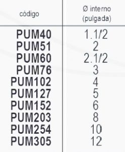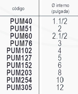 | Código | PUM40 1.1/2, PUM51 2, PUM60 2.1/2, PUM76 3, PUM102 4, PUM127 5, PUM152 6, PUM203 8, PUM254 10, PUM305 12 |