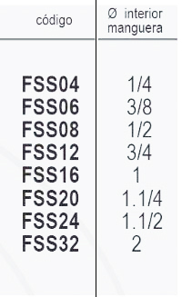 FSS04 1/4, FSS06 3/8, FSS08 1/2, FSS12 3/4, FSS16 1, FSS20 1.1/4, FSS24 1.1/2, FSS32 2