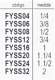 | Codigo | FYSS04 1/4, FYSS06 3/8, FYSS08 1/2, FYSS12 3/4, FYSS16 1, FYSS20 1.1/4, FYSS24 1.1/2, FYSS32 2 |