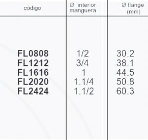 | Codigo | FL0808 1/2 – 30.2, FL1212 3/4 – 38.1, FL1616 1 – 44.5, FL2020 1.1/4 – 50.8, FL2424 1.1/2 – 60.3 |