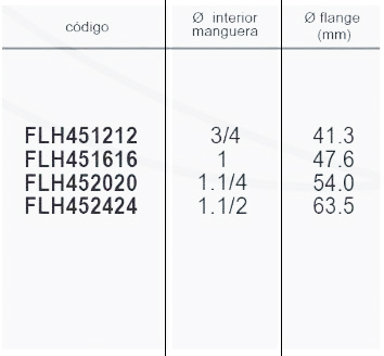 | Codigo | FLH451212 3/4 – 41.3, FLH451616 1 – 47.6, FLH452020 1.1/4 – 54.0, FLH452424 1.1/2 – 63.5 |